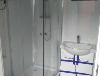 Сантехника: компактный стоячий унитаз, умывальник с аксессуарами, тумба под умывальник, душевая кабинка, бойлер 50л, необходимы сантехнические разводы. Кроме того, стены обшиты водостойкими стеновыми панелями.