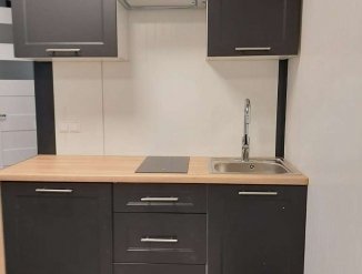 Кухня: 3 подвесных кухонные шкафа (2 больших и 1 маленькая), вытяжка, шкаф со встроенным холодильником, тумба с 3 ящиками, тумба под раковину, раковина с краном, керамическая столешница с 2 конфорками, столешница, необходимые сантехнические подключения.