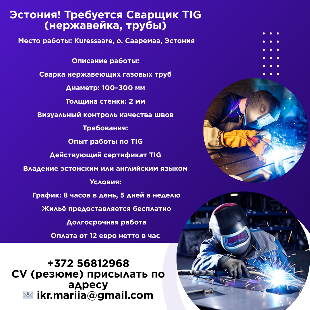 Эстония! Требуется Сварщик TIG (нержавейка, трубы)