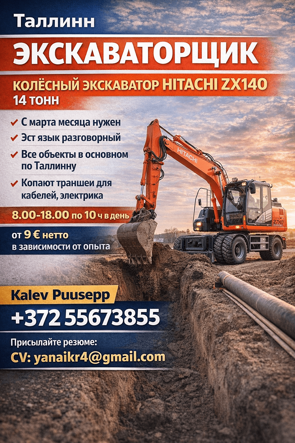 Таллинн Экскаваторщик колёсный экскаватор Hitachi ZX140 14 тонн с марта месяца нужен эст язык разговорный все объекты в основном по Таллинну копают траншеи для кабелей электрика 8.00-18.00 по 10 ч в день от 9 нетто в зависимости от опыта
