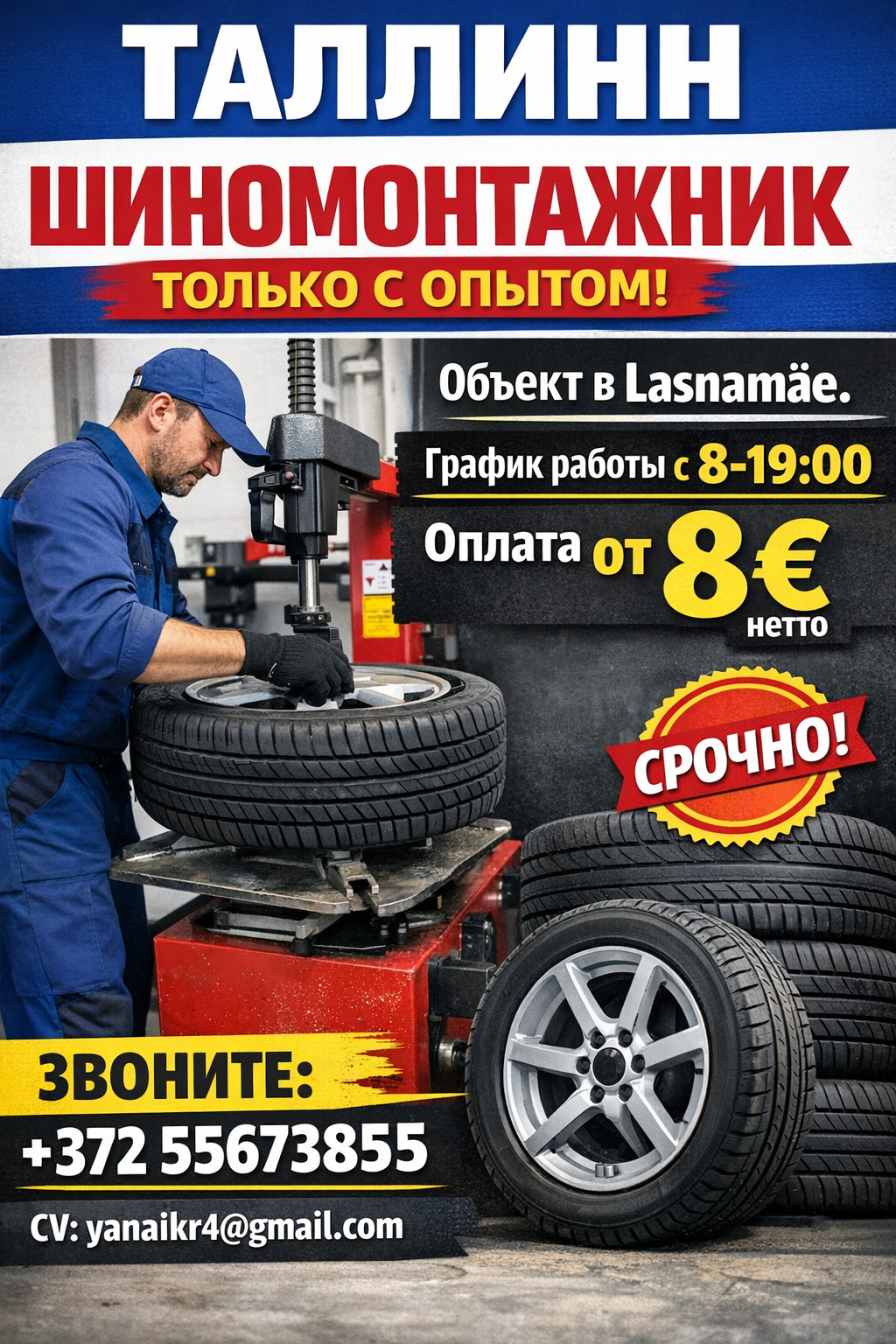 Таллинн Шиномонтажник Только с опытом! Объект в Lasnamäe. График работы с 8-19:00 Оплата от 8 нетто Звоните +37255673855 CV yanaikr4@gmail.com сделай объявление с картинкой