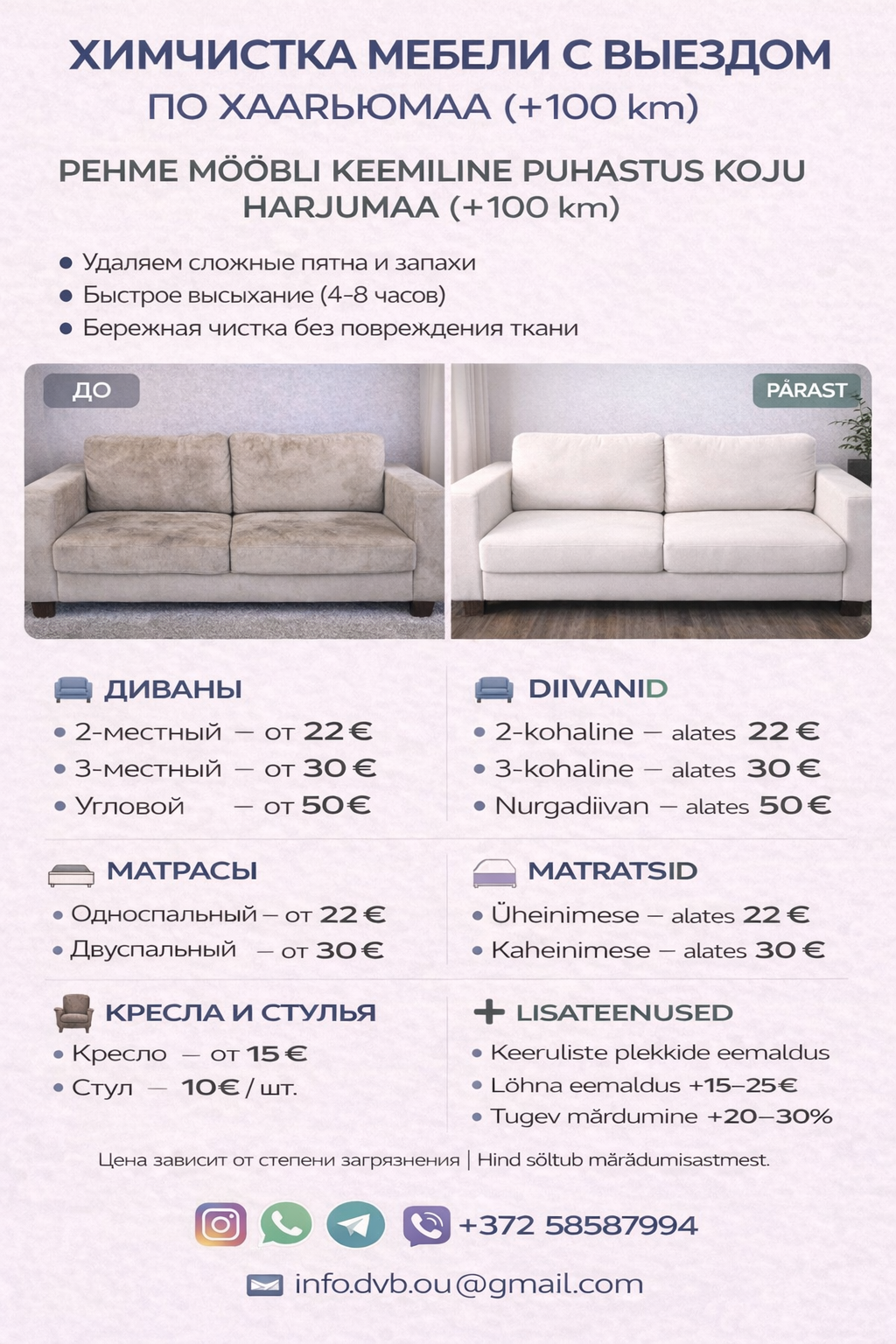 Предложение услуг, Химчистка мягкой мебели с выездом в Эстонии, Таллинн, Harjumaa